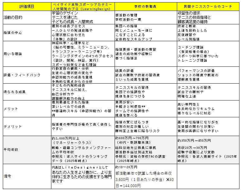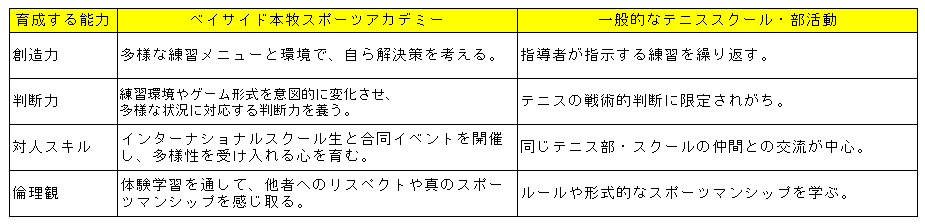 テニススクールの**「専門的な指導」と、学校の部活動が持つ「公共性・協調性」の良い部分を掛け合わせ、そこに私のグローバルな教育知見**を加えることで、私たちは独自の価値を提供しています。
